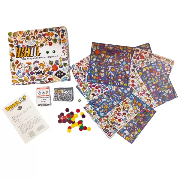 Se el primer jugador en encontrar los objetos que piden las tarjetas, colocales las fichas de tu color encima antes que los demas, y conviertete en GRAN BUSCADOR!