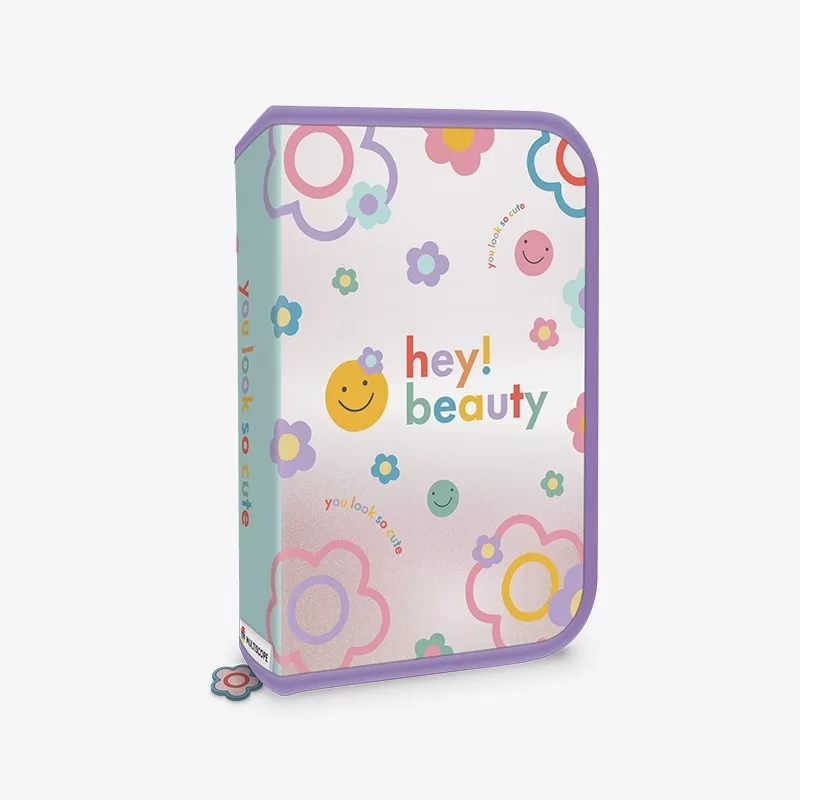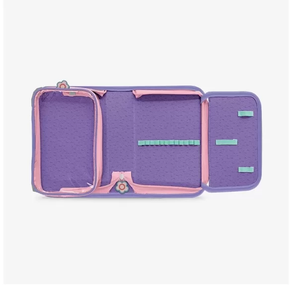 Interior: 1 amplio compartimento transparente con cierre para colocar elementos sueltos, 24 elásticos para acomodar lápices y 3 elásticos más anchos para otros útiles