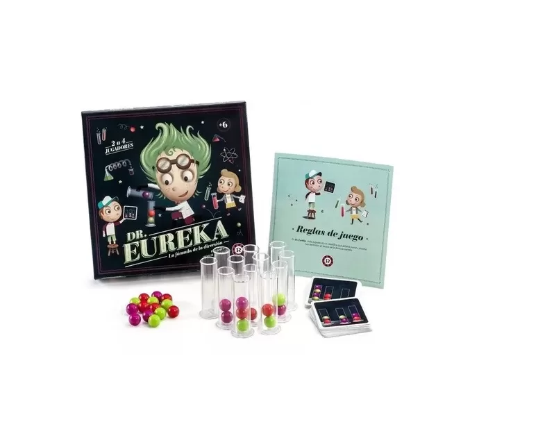 Dr. Eureka, cada jugador es un científico que deberá poner a prueba sus destrezas en busca de la fórmula secreta. Para ello deberá manipular las moléculas a través de los tubos de ensayo y conseguir la dosis justa de rapidez y concentración. Contenido: 12 tubos de ensayo, 24 bolas de colores, 54 tarjetas, 1 reglamento